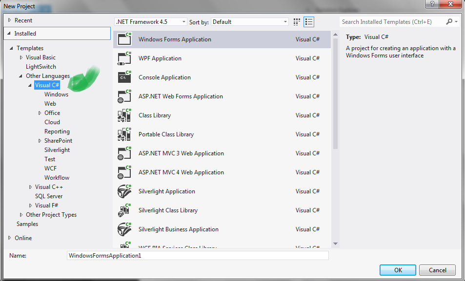 Step 3: Select "Visual C#" from Project Type & "Windows Form Application" from Project Templates.